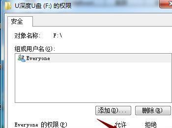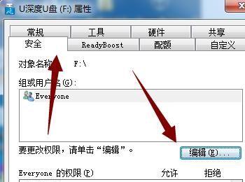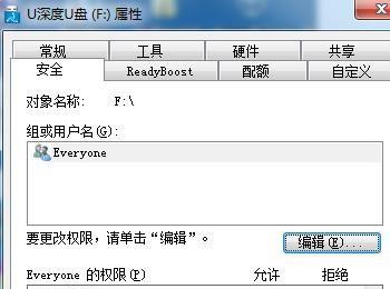 在U盘属性界面点击上面的安全就可以看到读写权限全是拒接的。点击右侧的“编辑”