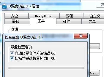 在修复选项点击选择自动修复文件系统错误和扫描并尝试恢复坏扇区。点击下面的“开始”就会自动修复U盘出现的问题。修复好之后打开U盘就可以读写了。
