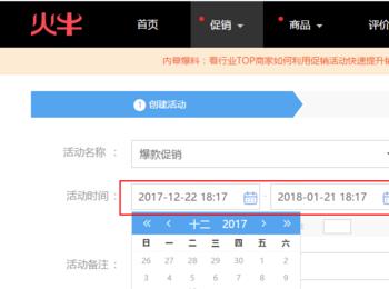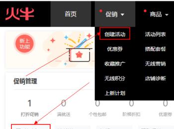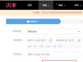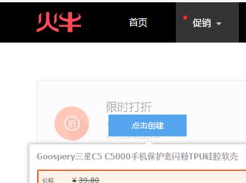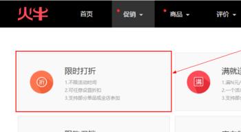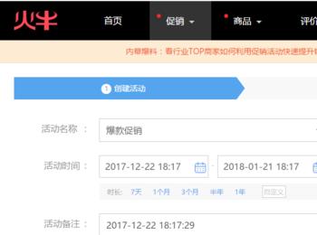 在火牛首页【促销管理】栏找到【显示折扣】,点击进入活动设置页面;或者在首页导航栏【促销】里面点击【创建活动】按钮,进入活动选择页面。在页面找到【限时折扣】选项,鼠标经过可以预览活动效果,确认创建以后,点击【点击创建】按钮进入活动创建页面。