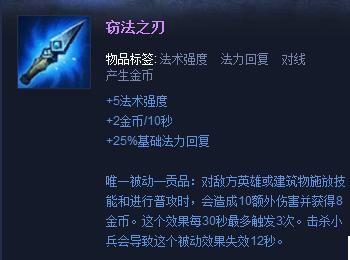基本上都是以“窃法之刃+饼干”出门,因为莫甘娜有免疫控制技能,有同时兼顾着强大的控制技能,所以在前期可以说你往前靠的时候对面都会自觉的向后跑,这件装备可以让你不停的平a对面获取金币的同时,还可以找机会用Q技能控制对面;(装备属性:+5法术强度、+2金币/10秒、+25%基础法力回复,被动详见图)