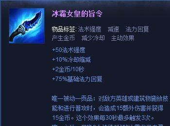 第一件大装可以选择做出“冰霜女皇的旨令”,既可以利用这件装备的主动技能减速敌人,从而提高Q技能的命中率,又能在对面打野来gank的时候减速对方然后逃跑,或者是自己家打野来gank时减速对面;(装备属性:+50法术强度、+10%冷却缩减、+2金币/10秒、+75%基础法力回复,被动详见图)