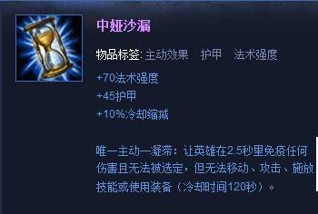 第三件装备可以做出“中娅沙漏”,中期和后期团战找到机会可以闪现进场直接开启大招往对面C位靠近,在被集火的时候按下金身,这是莫甘娜最常用的团战技巧,相当有效;(+70法术强度、+45护甲、+10%冷却缩减,被动详见图)