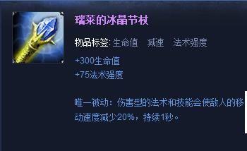 第四件准备可以做出“瑞莱的冰晶节杖”,虽然现在冰杖的被动减少被削弱了,但是对于莫甘娜大招的开启还是有很大的提升作用,再加上该装备还有生命值和法术强度加成,可以提升自身生存能力和伤害;(装备属性:+300生命值、+75法术强度,被动详见图)