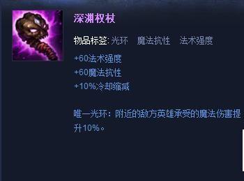 第五件装备可以选择做出“深渊权杖”,虽说莫甘娜有E技能法术护盾,但是在后期增加一些魔抗还是相当有必要的,同时该装备还有法术强度以及被动范围对敌方英雄承受的魔法伤害提升;(装备属性:+60法术强度、+60魔法抗性、+10%冷却缩减,唯一光环:附近的敌方英雄承受的魔法伤害提升10%)