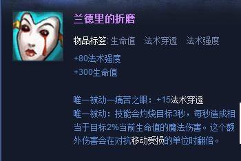 最后一件装备可以选择“兰德里的折磨”,提升对敌方前排的伤害,而且还有血量增加,能够防止进场被秒的情况;(装备属性:+80法术强度、+300生命值,唯一被动—痛苦之眼:+15法术穿透,其他被动详见图)