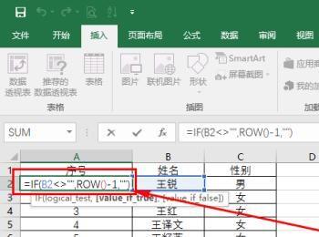 在A2单元格输入公式“ =IF(B3<>””,ROW()-1,””) ”,根据B列的内容来自动生成序号