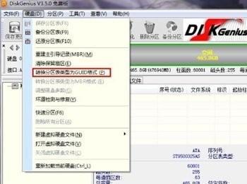 除了可以使用命令,转换硬盘格式,大家还可以用到PE工具中的DiskGenius分区软件转换硬盘格式。进入PE工具,打开DiskGenius软件,选中下面需要转换格式的“硬盘”,然后点击开始菜单中的“硬盘”,其中有一项就是“转换硬盘分区表类型为GUID模式”,如下图所示。