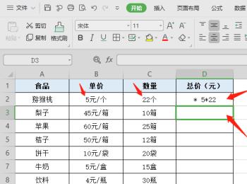 2. 第二步,在总价单元列中的D2单元格内输入“* 5*22”,其中5是单价中的数字,22是数量中的数字,我们还可以使用**,或者##等替代星号加空格。点击D3单元格,接着按“CTRL E”快捷键。