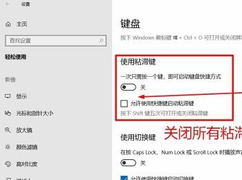 4. 第四步进入【键盘】页面后,根据下图箭头所指,先关闭【使用沾滞键】,接着取消勾选【允许使用快捷键启动沾滞键】。