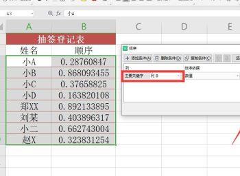 3. 第三步先选中所有单元格,接着打开【排序】窗口,接着将【主要关键字】设为随机数所在列,然后根据下图箭头所指,点击【确定】选项即可完成排序。