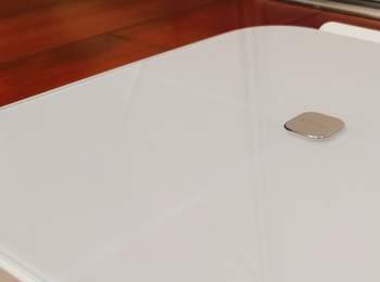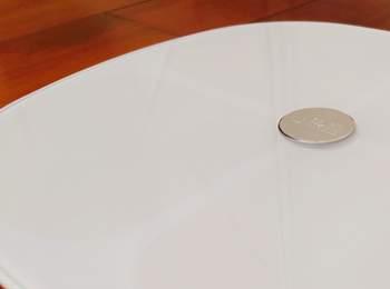 云康宝体脂秤精致的方圆形造型,秤面通体纯白的玻璃质感,搭配四周圆润的处理,C位金属的LOGO,隐藏式的数字显示,这也让人一见之下新生好感。下方有简单的使用指南,对于新手用户很友好。四个ITO电极隐藏在钢化玻璃秤面之下,上下、左右对称,可以看到这四个ITO电极区域与周边颜色不同。