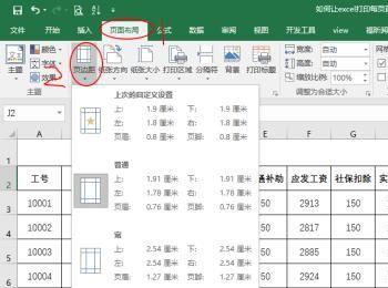 按esc回到工作表中,依次点击工具栏页面布局-页边距-自定义边距