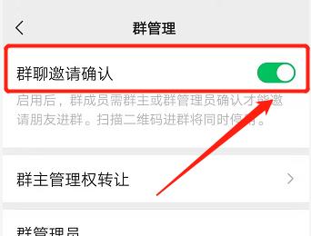3. 最后进入【群管理】页面,根据下图箭头所指,将【群聊邀请确认】选项后的圆圈向右滑动,启用该功能。