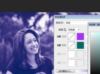 目前默认的模式是单色系,因为我们刚才扔掉了图像色彩。所以黑白色就是单色系图像,选择双色调模式就可以了。颜色设置根据你自己的喜欢定就行了~