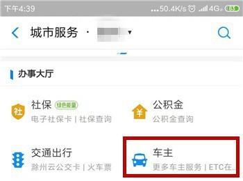 3. 第三步在【城市服务】页面中,根据下图所示,点击【车主】选项。