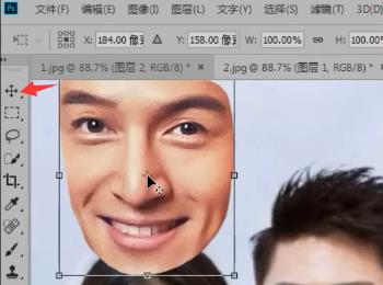 2. 然后点击左侧的移动工具,按住图片,拖动到另一张图片上,进行复制;