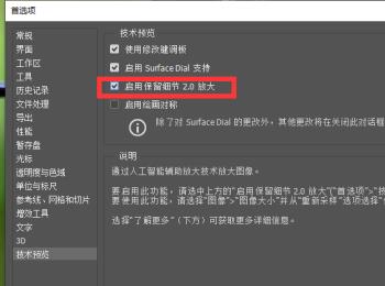 3. 第三步打开【首选项】窗口后,先找到并勾选【启用保留细节2.0放大】,接着根据下图箭头所指,点击【确定】选项。
