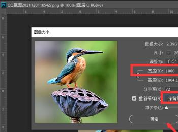 5. 第五步在弹出的窗口中,先按照需求调整宽度、高度,接着勾选【重新采样】并设置【保留细节2.0】,然后根据下图箭头所指,点击【确定】选项。