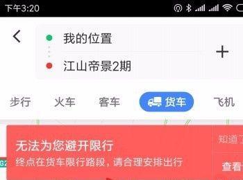 接下来如果出现无法避开的限行或是限重路段,会给出一个提示,最后我们选择一个导航的路线,点击“货车导航”按钮就可以了。