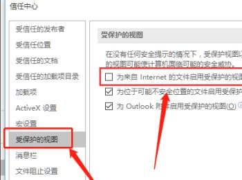 4. 如图,在弹出的信任中心窗口中,点击左侧的受保护的视图选项,然后在右侧找到“为来自Internet的文件启用受保护的视图”的选项,取消前面的勾选,最后点击确定后,重新打开文件就不会弹出错误提示了。