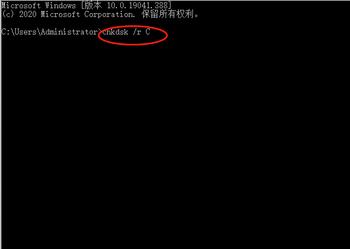 2. 在打开的窗口中,输入chkdsk /r C指令后,回车,然后再根据提示输入Y