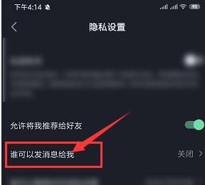 5. 第五步进入【隐私设置】页面后,根据下图箭头所指,点击【谁可以发消息给我】选项。