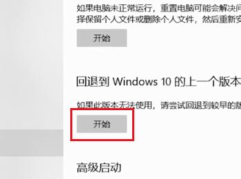 4. 第四步在右侧页面中,找到【回退到Windows10的上一个版本】菜单,接着根据下图所示,点击【开始】选项。