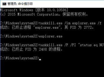 1. 首先打开电脑中的命令提示符窗口,输入面的命令:taskkill.exe /im explorer.exe /f(taskkill.exe即结束进程的程序,/im则可以输入想要关闭的进程名称),回车。