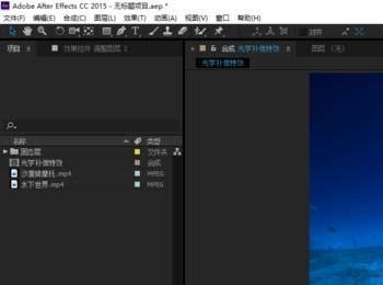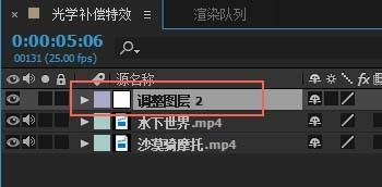 4、在【效果和预设】面板中搜索“光学补偿”特效,并将此特效拖动到调整图层上;