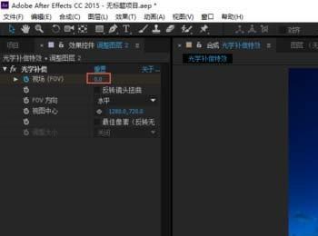 6、将指针定位到“4秒”的位置,单击调整图层,给【光学补偿】特效中【视场】打上关键帧,并设置值为0;