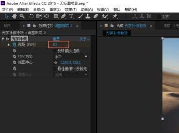 5、将指针定位到“沙漠摩托”图层结束的位置,单击调整图层,给【光学补偿】特效中【视场】打上关键帧,并设置值为0;