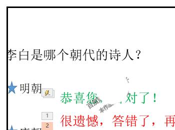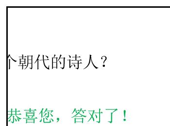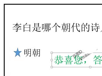 9、测试下效果,顺序点击:幻灯片放映-从头开始,然后,鼠标点下“唐朝”,看下“恭喜您,答对了!”是否有放大的显示出来。