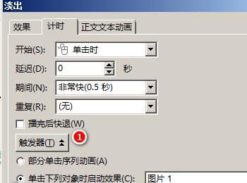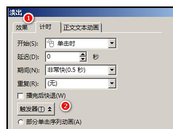 12、弹出“淡出”动画效果设置框,然后,点开“计时”选项卡,下面弹出相关内容。鼠标点击“触发器”,下方弹出相关内容,点选“单击下列对象时启动效果”;然后,再点下小三角,在弹出的列表中点“明朝”;最后记得点击确定。
