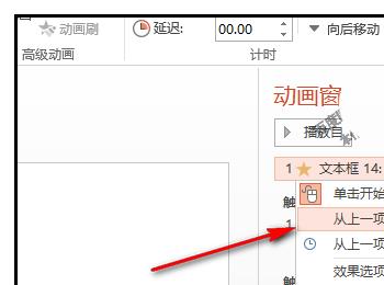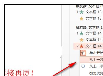 13、在“很遗憾,答错了,再接再厉!”放大/缩小动画这里点一下,右边显示小三角,点下小三角,弹出的菜单中点“从上一项开始”;如下图所示。