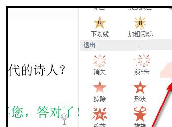 5、选中“恭喜您,答对了!”文本框,设置为”淡出“动画;再选中“恭喜您,答对了!”文本框,再设置为“放大/缩小”动画。