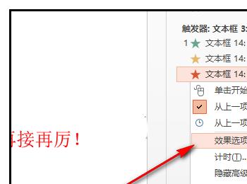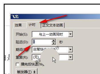 17、再次点下小三角,弹出菜单中点“效果选项”;弹出的对话框中,在“延迟”这里,设置为3秒。再点确定。