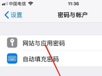 3.第三步,在下图所示的密码与账户页面中,点击箭头所指的网站与应用密码选项。