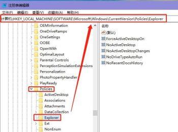 7. 如图,就打开了【注册表编辑器】的窗口,在窗口中,依次展开:【计算机\HKEY_LOCAL_MACHINE\SOFTWARE\Microsoft\Windows\CurrentVersion\Policies\Explorer】。
