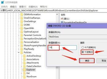 9.对新建的【NoDrives】值双击,基数点选上【10进制】,数值数据设置为【16】后,点击【确定】按钮,然后重启电脑,就可以隐藏硬盘分区了。