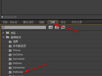 3. 找到【DeNoiser】的特效拖动到右侧的视频轨道或者音频轨道上,这样在右侧就多了条绿色的线条。