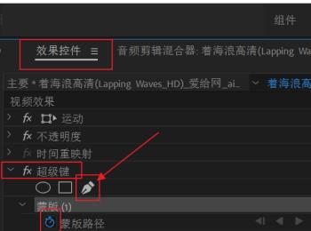 3. 第三步,点击编辑功能,然后选择效果控件,在效果控件页面中,展开超级键,并点击展开项目中的钢笔工具,再在蒙版路径处,点开视频帧。