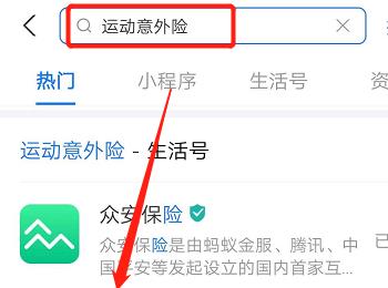 3.第三步,在下图所示的搜索页面中,输入并搜索运动意外险,接着点击箭头所指的运动意外险选项。