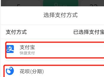 5.第五步,来到下图所示的页面后,点击选择付款方式,可以选择支付宝或者花呗分期选项,如果选择花呗的话,还可以免除手续费呢。