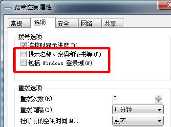 打开宽带连接属性之后,找到—选项—-把断线自动连接。还有提示名称和密码还有登陆域前面的勾去掉