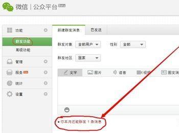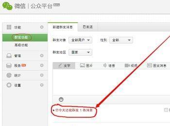 1、服务号是每月只能群发一条消息,也就是第二条消息要等一个月,否则无法群发的。如下图所示: