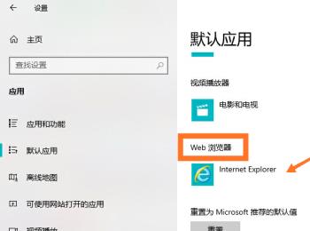 4. 第四步,在打开的应用窗口中,点击左侧的默认应用选项,然后在右侧的详情页面中,可以看到web浏览器分类,在下方为IE浏览器,这代表当前IE浏览器为电脑中的默认浏览器。