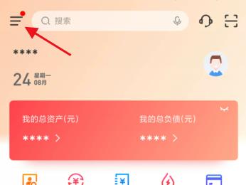 1.第一步,点击并打开交通银行软件,接着点击左上角箭头所指的三图标。
