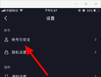 4. 第四步进入【设置】页面后,根据下图箭头所指,点击【账号与安全】选项。