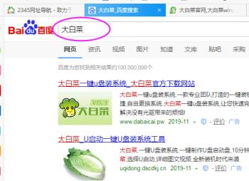 1. 首先打开电脑上的浏览器,进入百度。输入“大白菜”进行搜索