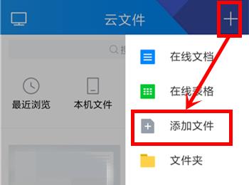 2. 进入云文件页面后,点击右上角的“+”号,在弹出菜单中点击“添加文件”。